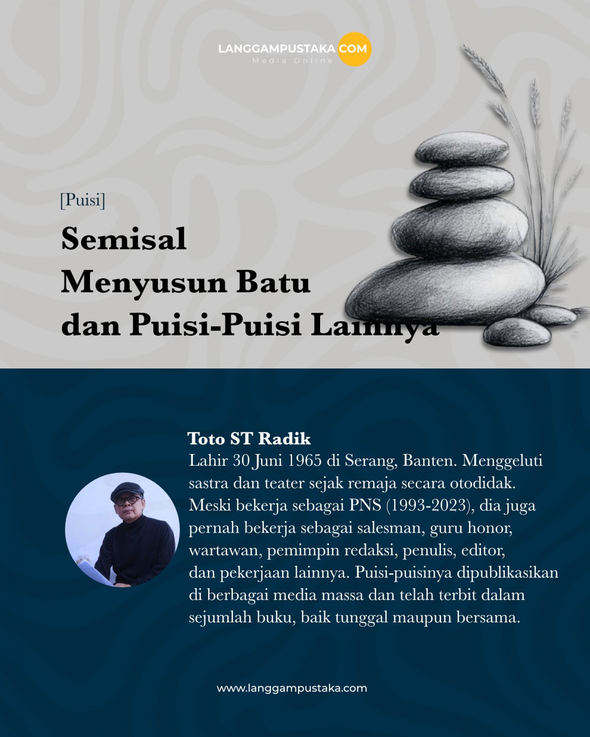 Toto ST Radik lahir 30 Juni 1965 di Serang, Banten. Menggeluti sastra dan teater sejak remaja secara otodidak. Meski bekerja sebagai PNS (1993-2023), dia juga pernah bekerja sebagai salesman, guru honor, wartawan, pemimpin redaksi, penulis, editor, dan pekerjaan lainnya. Puisi-puisinya dipublikasikan di berbagai media massa dan telah terbit dalam sejumlah buku, baik tunggal maupun bersama. Saat ini (masih) tinggal di Kota Serang***